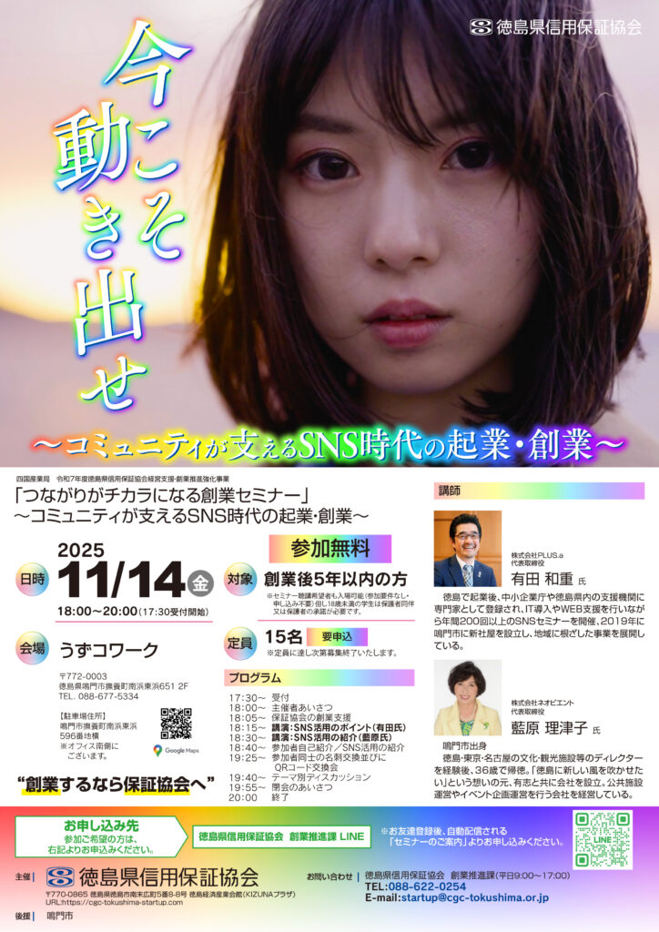 2025/10/08 鳴門で創業セミナーを開催します 令和7年11月14日(金) 18時~20時 うずコワーク 15名 鳴門で創業セミナーを開催します!テーマは「コミュニティが支えるSNS時代の起業・創業」 講師に(株)PLUS.a代表の有田氏と㈱ネオビエント代表の藍原氏をお迎えして、SNS活用のポイントや注意点をご紹介します。 参加申込はこちら ※当協会公式LINEにお友達登録後、自動配信される「セミナーのご案内」よりお申し込みください。
