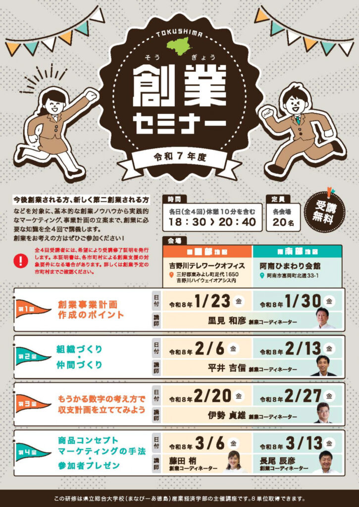 とくしま産業振興機構と徳島県が主催の、創業セミナーが県西部と県南部で開催されます。